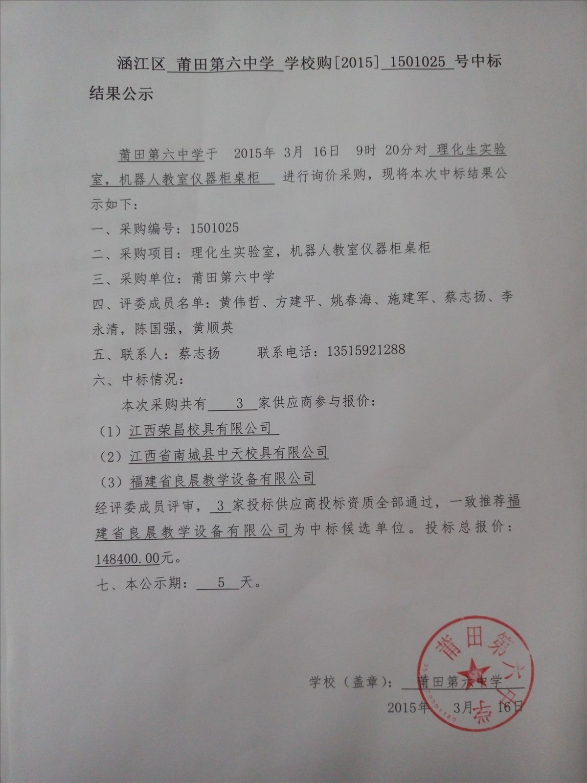 理化生实验室、机器人教室普教仪器中标公告