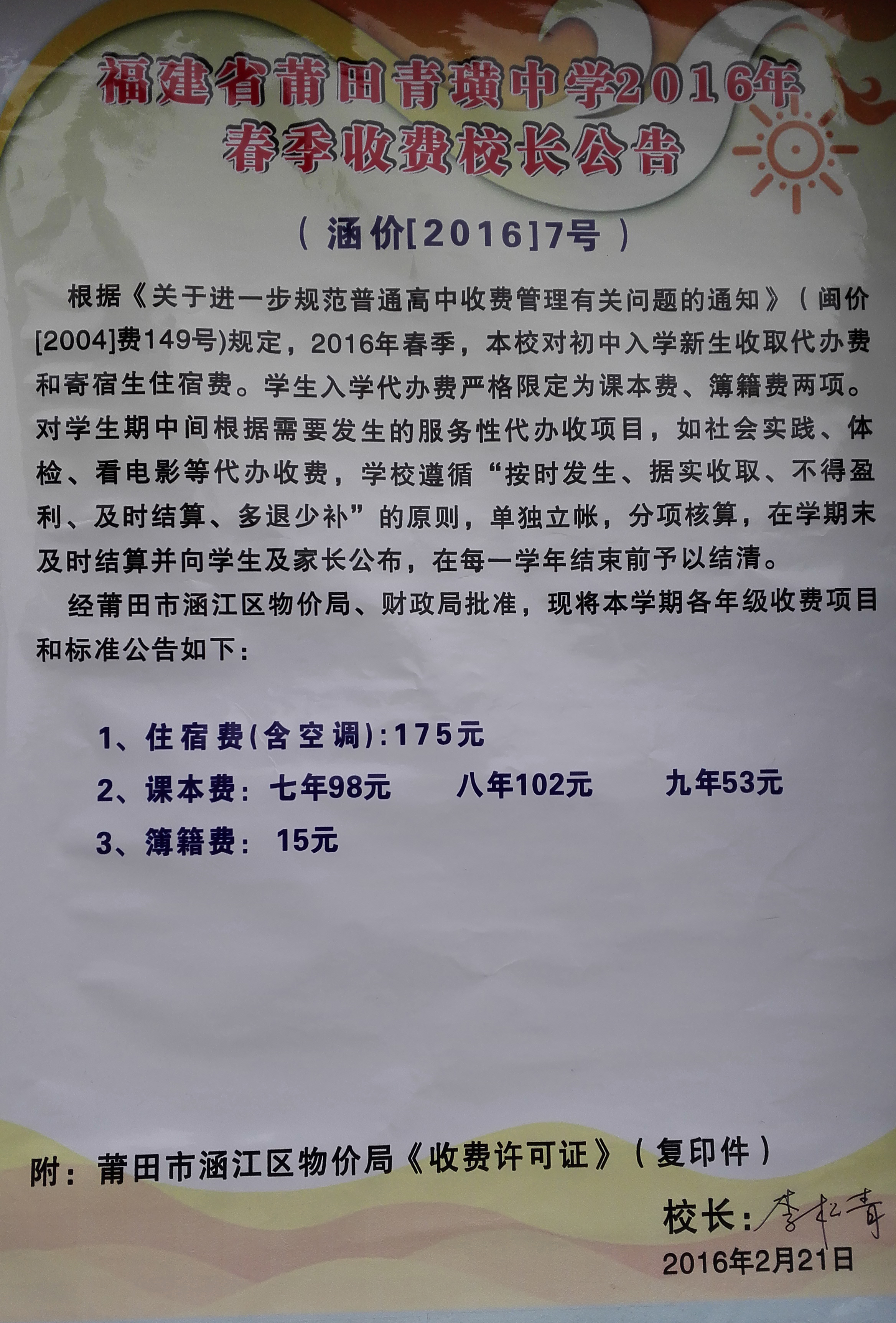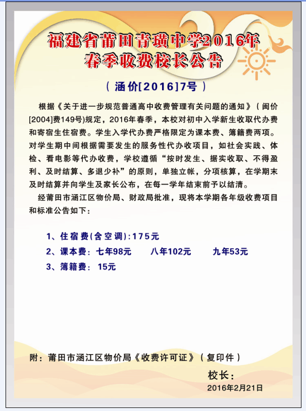 莆田青璜中学2016年春季收费校长公告
