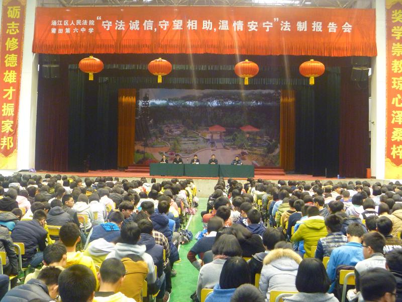 为了进一步让法制走进校园,进一步加强中学生的法律意识,接受法制教育,自觉遵纪守法,学会运用法律保护自己,做一个知法、守法的合格中学生。3月16日下午我校有幸邀请到了涵江区人民法院刑庭余铮清庭长、助理审判员林晟同志以及法院的其他同志为我校师生做专场法制教育报告。 首先是赠书仪式,法院为我校师生赠送了包括《送法进校园》等“法律六进”系列丛书。其次由法院林晟同志作“守法诚信,守望相助,温情安宁”法制专题报告,报告结合中学生年龄特点,用一个个具体的事例,以案释法,以法论事,深入浅出的给师生做了场生动、精彩的报告,告诉我们在日常生活中要做一名知法、守法的合格中学生,使在场的全体师生深受教育,可谓是学校法制教育的一次锦上添花。(政教处) 法制报告