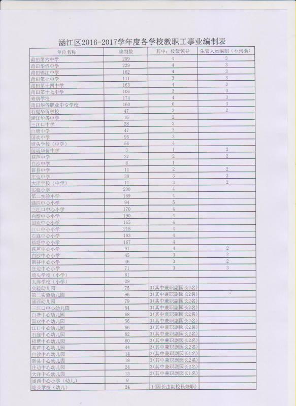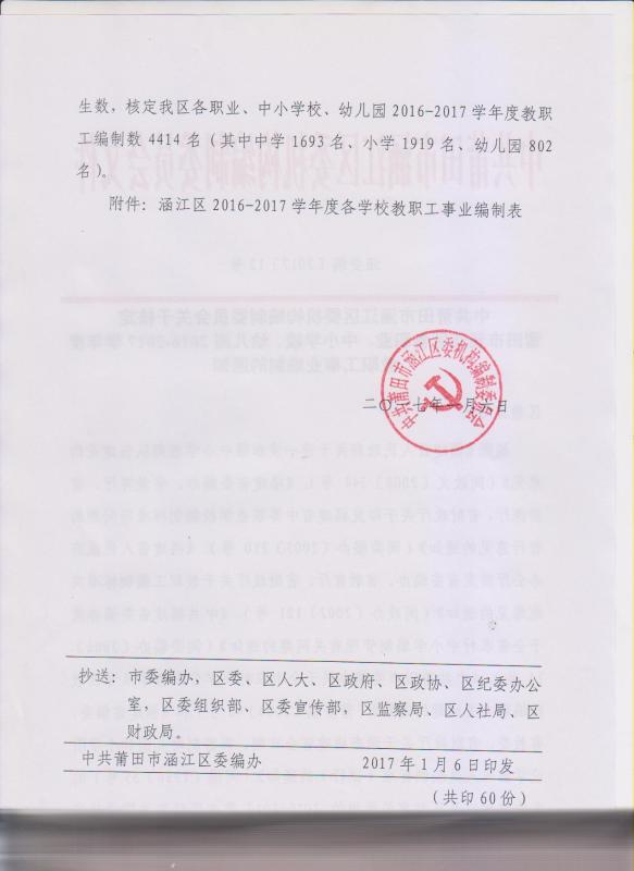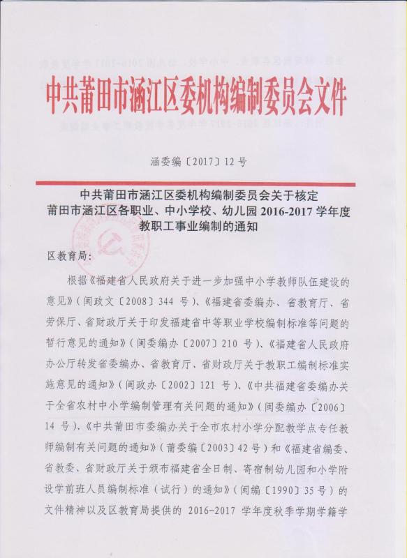 中共莆田市涵江区委机构编制委员会关于核定莆田市涵江区各职业、中小学校、幼儿园2016-2017学年度教职工事业编制的通知(涵委编【2017】12号)