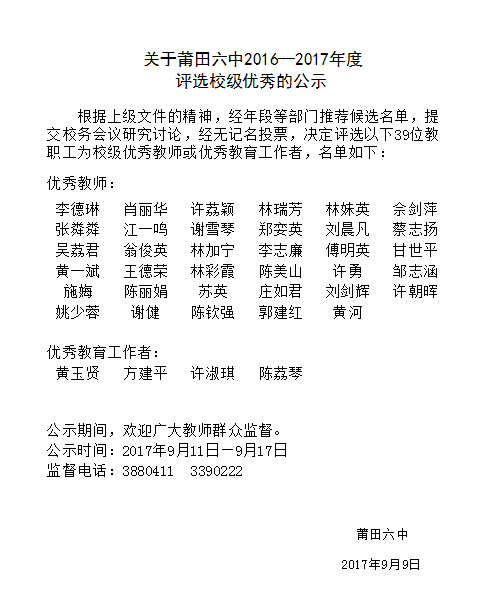 关于莆田六中2016—2017年度评选校级优秀的公示