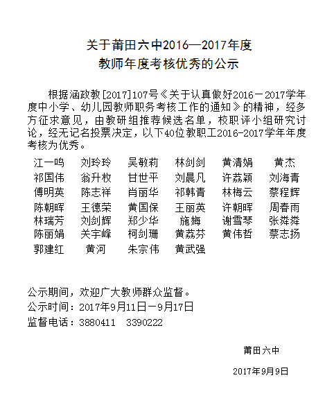 关于莆田六中2016—2017年度教师年度考核优秀的公示