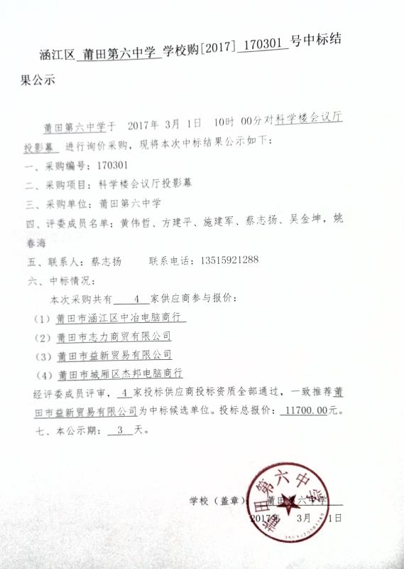 会议厅投影幕中标结果公示