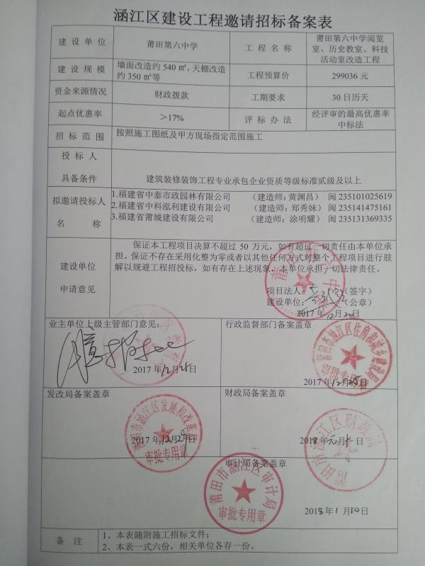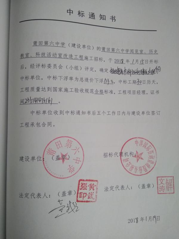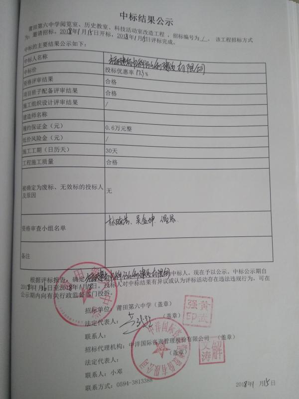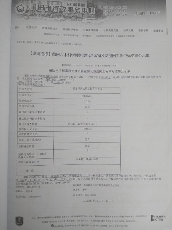 莆田六中科学楼外墙铝合金窗及防盗网工程中标结果公示